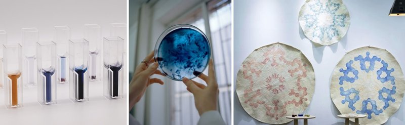 - neposredno “gojenje vzorcev”, kjer bakterije same prerastejo tekstil in ustvarijo nepredvidljive, organske vzorce.